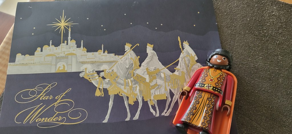 The card was used not only to record Balthazar’s travels, but also to offer the instructions about returning Balthazar. He is supposed to return to church on the Sunday closest to Epiphany (January 6th). This year, that meant yesterday, the 5th of January. Sure enough and miracle of miracles, he did return this past Sunday. All the Magi, both the beautiful ceramic set and their Playmobil counterparts, arrived on time to bestow their gifts to Jesus. This is clearly going to be a new tradition. The kids were thrilled to be a part of the telling of the Christmas story. The return of Balthazar to the Nativity set ranked up there with the placing of baby Jesus in the manger at the 5pm Christmas Eve worship service.
