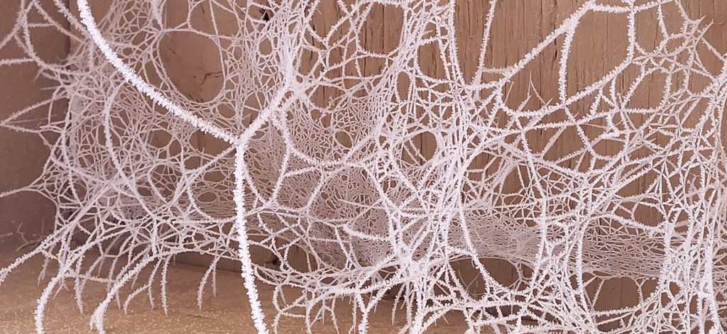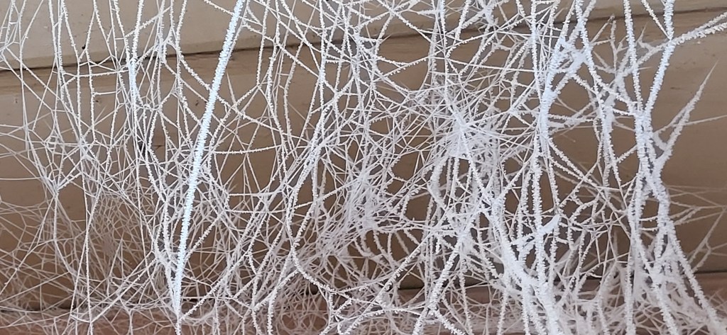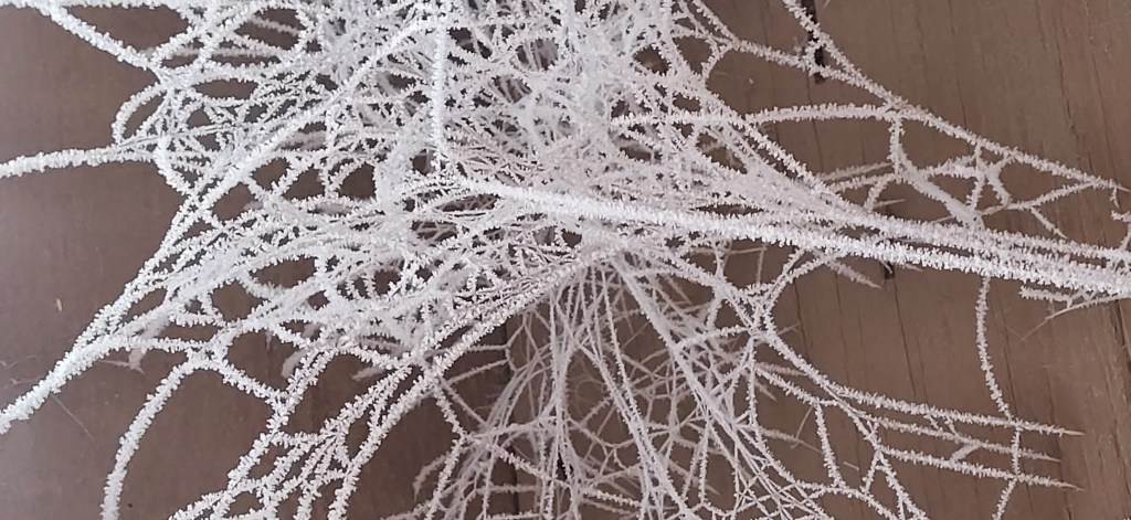 I think it was a rare confluence of events that made it so. In the eves of the overhang to the porch were these fragile ice crystal cobwebs. They were invisible to the naked eye normally (not that we’ve been doing a whole lot of outdoor sitting these days in -6 degrees), but the kerosene heater with an outdoor vent had come on. It was very cold, and the eves caught the moisture.